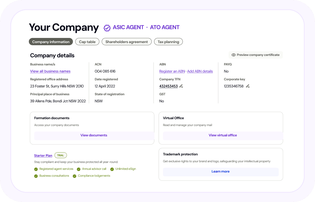 Legal, tax, accounting and compliance all together in one simple hub. Manage your business setup, paperwork, obligations and records without juggling tools, advisors or logins. Everything’s easy to find, and easier to stay on top of.